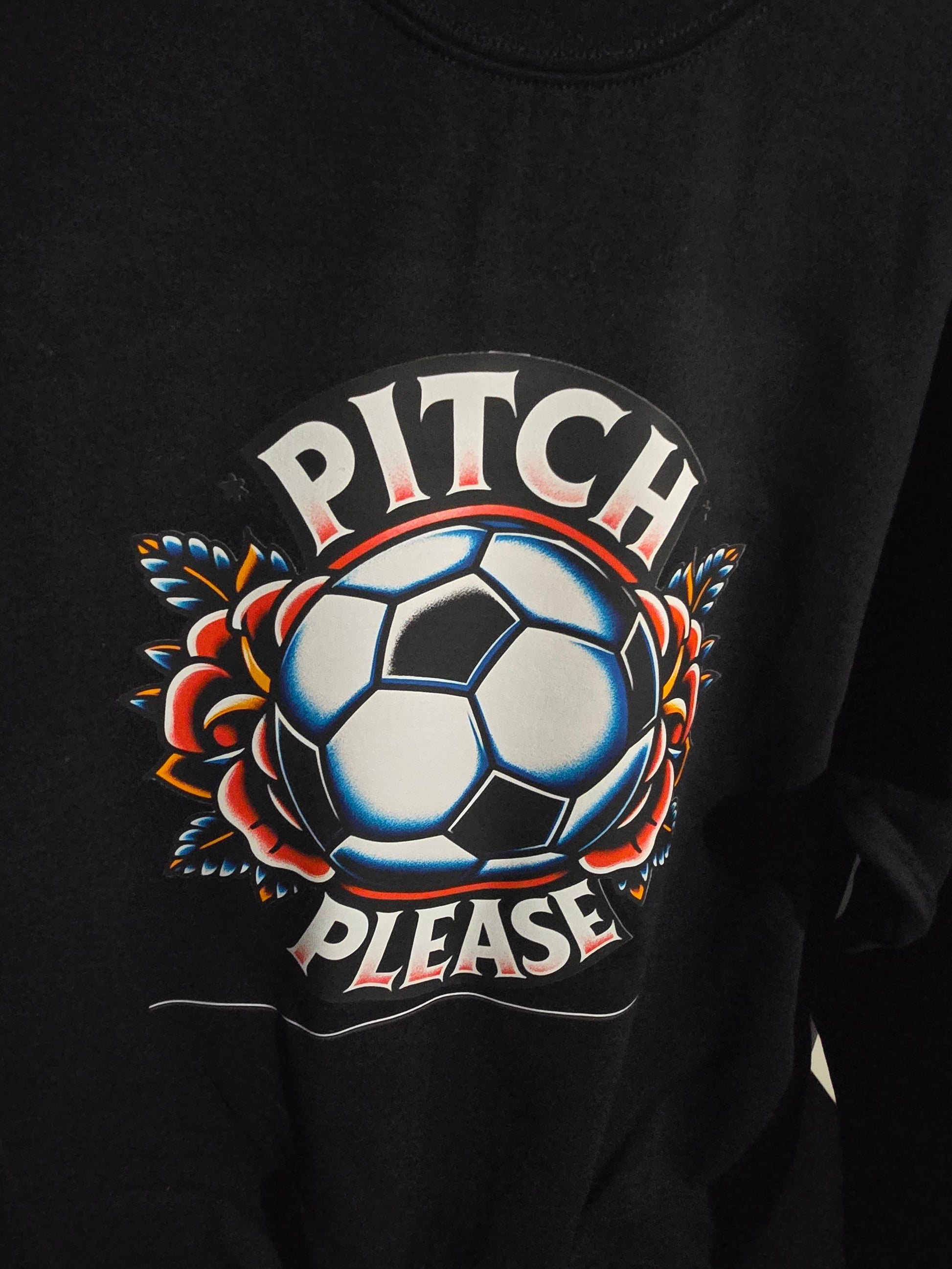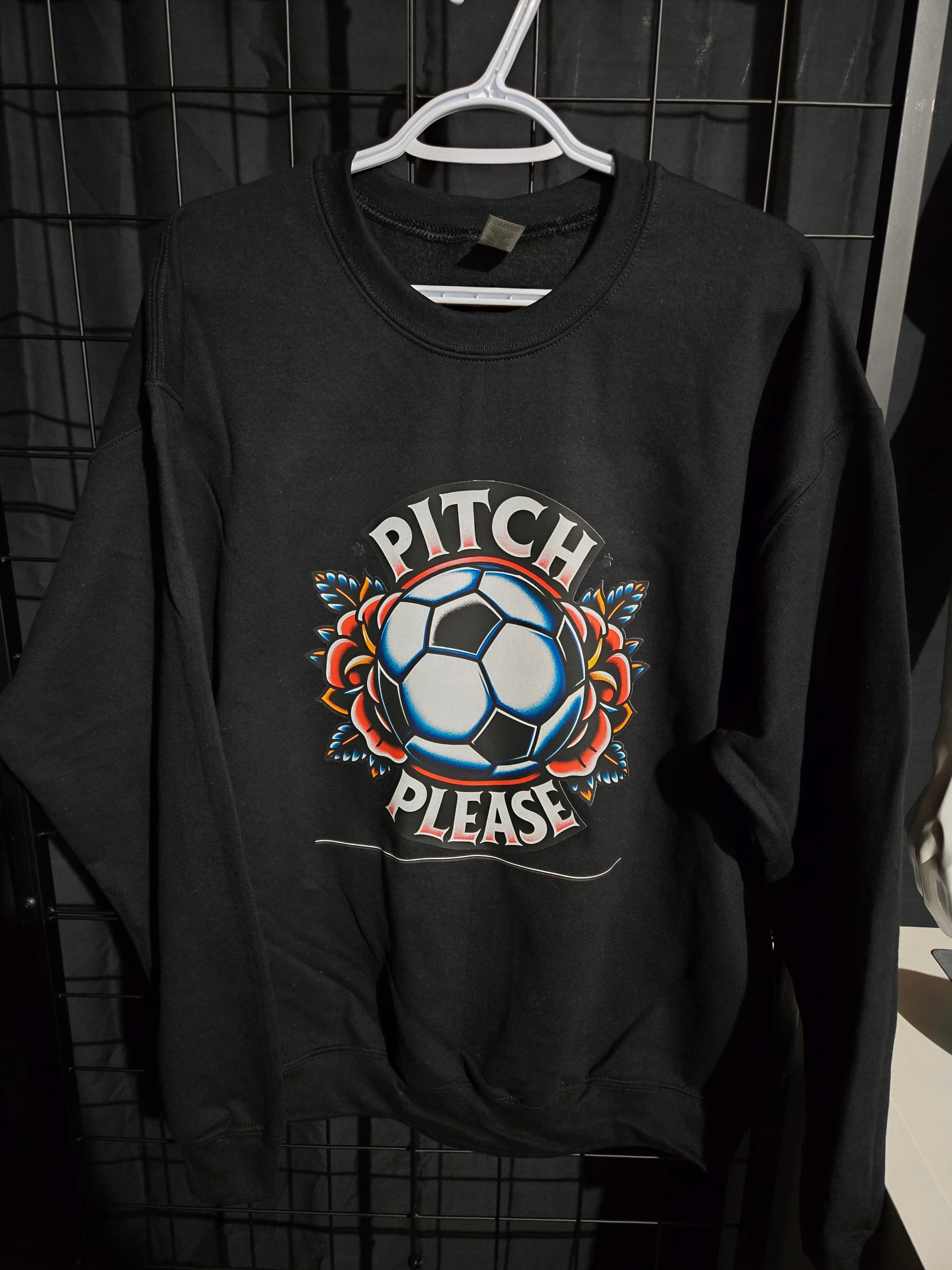 Elevate your game day style with our "Soccer Pitch Please" crew sweater! Crafted from a soft, breathable fabric, this cozy sweater features a bold, playful design that showcases your love for soccer. Perfect for layering on chilly match days or casual outings, it offers both comfort and a sporty flair. It's an essential addition to any soccer enthusiast's wardrobe. Show your passion for the game in style!