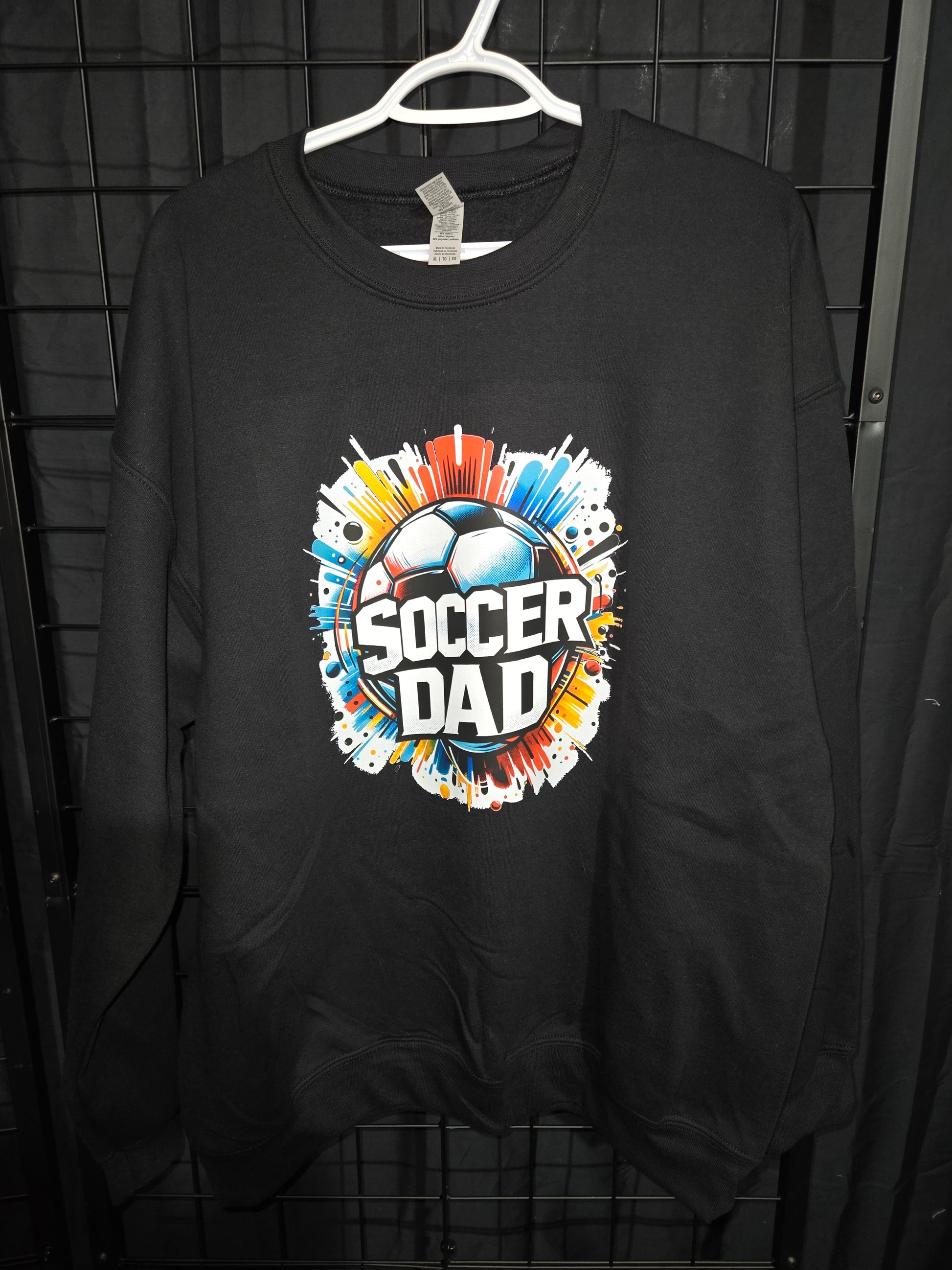 Show off your pride in style with the Soccer Dad Crew Sweater! This sleek black sweater features bold "Soccer Dad" lettering paired with an eye-catching blast effect that radiates energy and passion—just like your support on the sidelines.