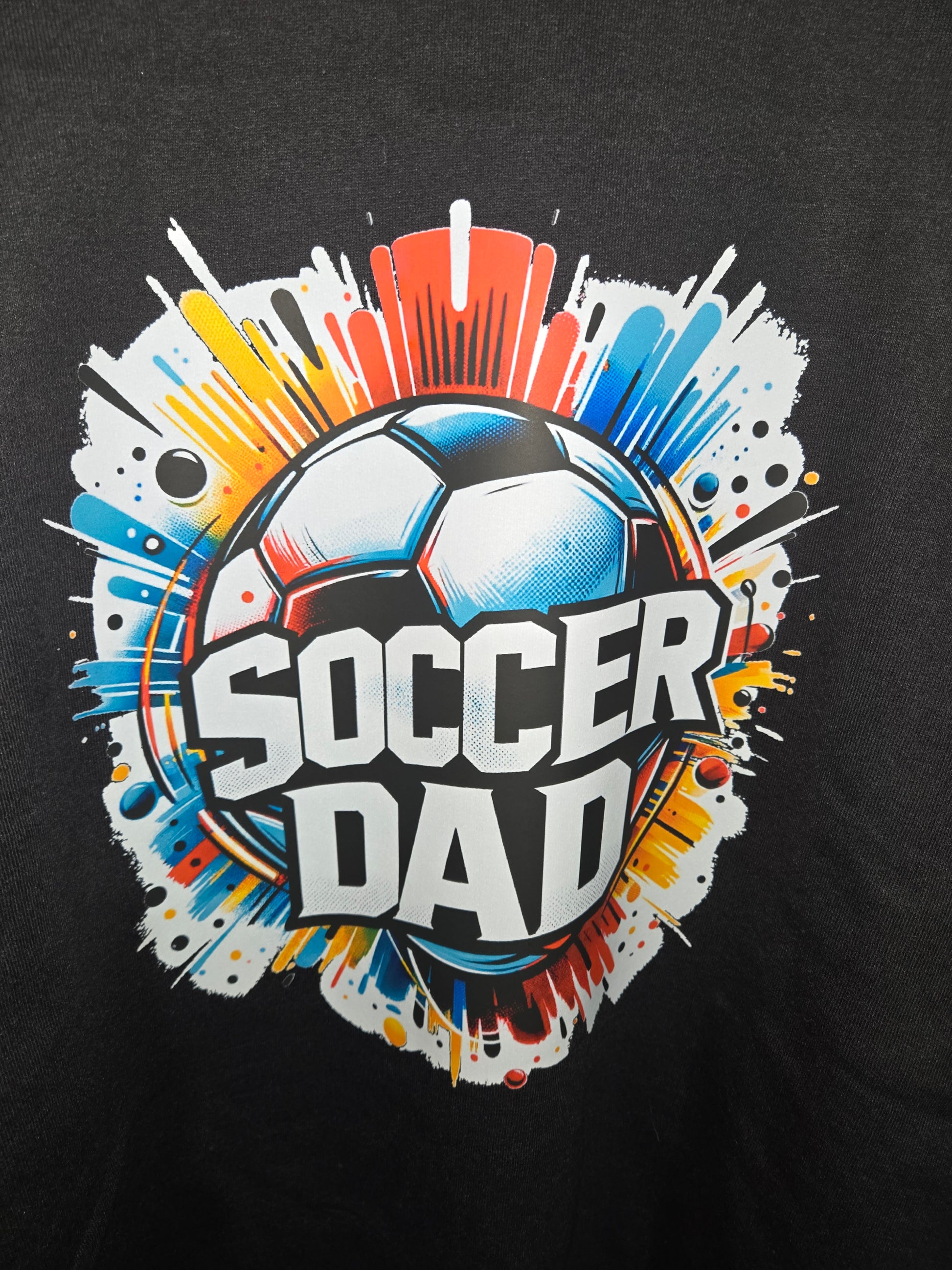 - Design: "Soccer Dad" text with dynamic blast-effect detailing