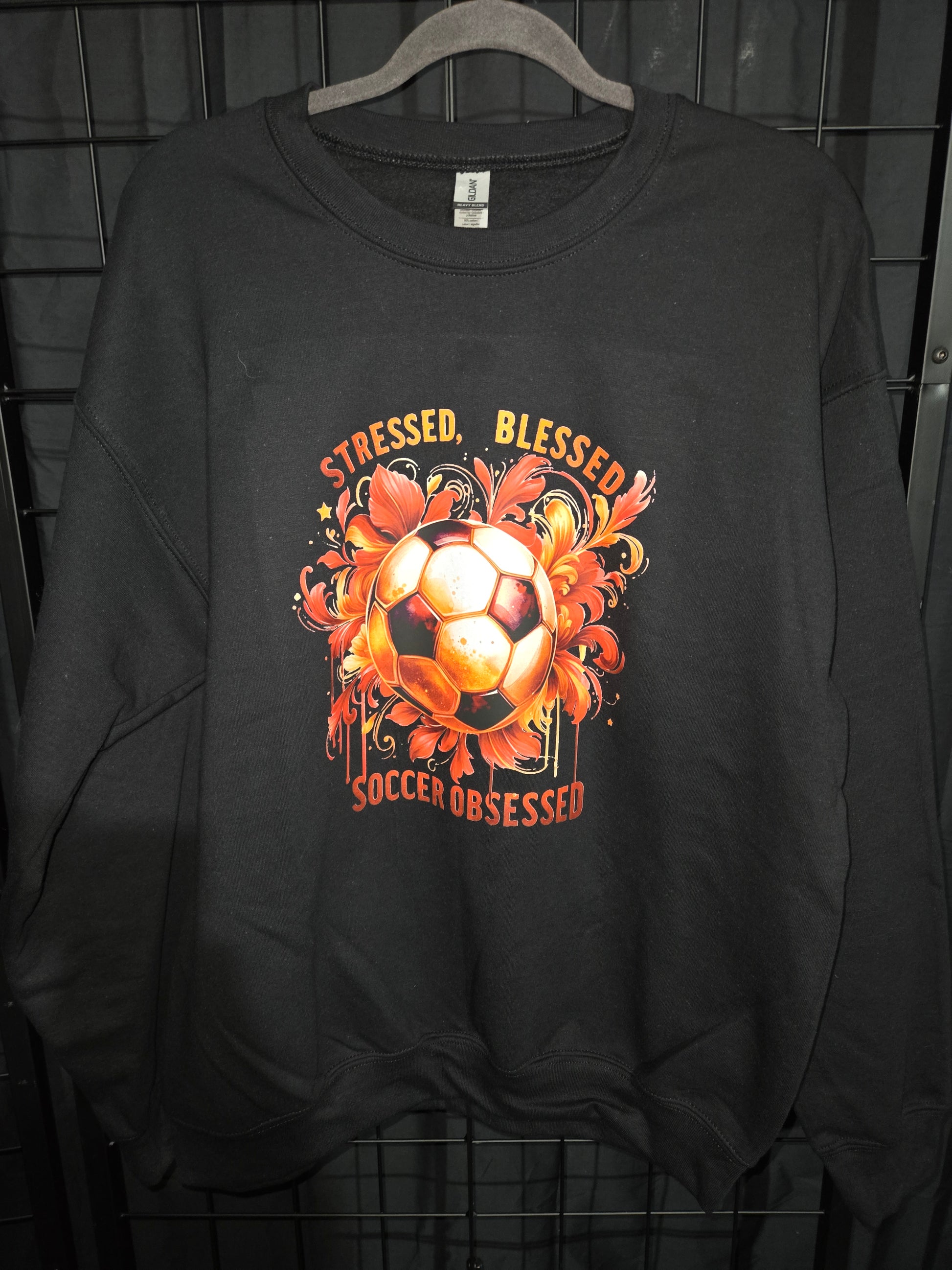 For the true soccer enthusiasts, the Stressed, Blessed, Soccer Obsessed Crew Sweater says it all! This sleek black crewneck features the vibrant phrase "Stressed, Blessed, Soccer Obsessed" alongside a stylish soccer-themed logo, making it the ultimate expression of your love for the beautiful game.